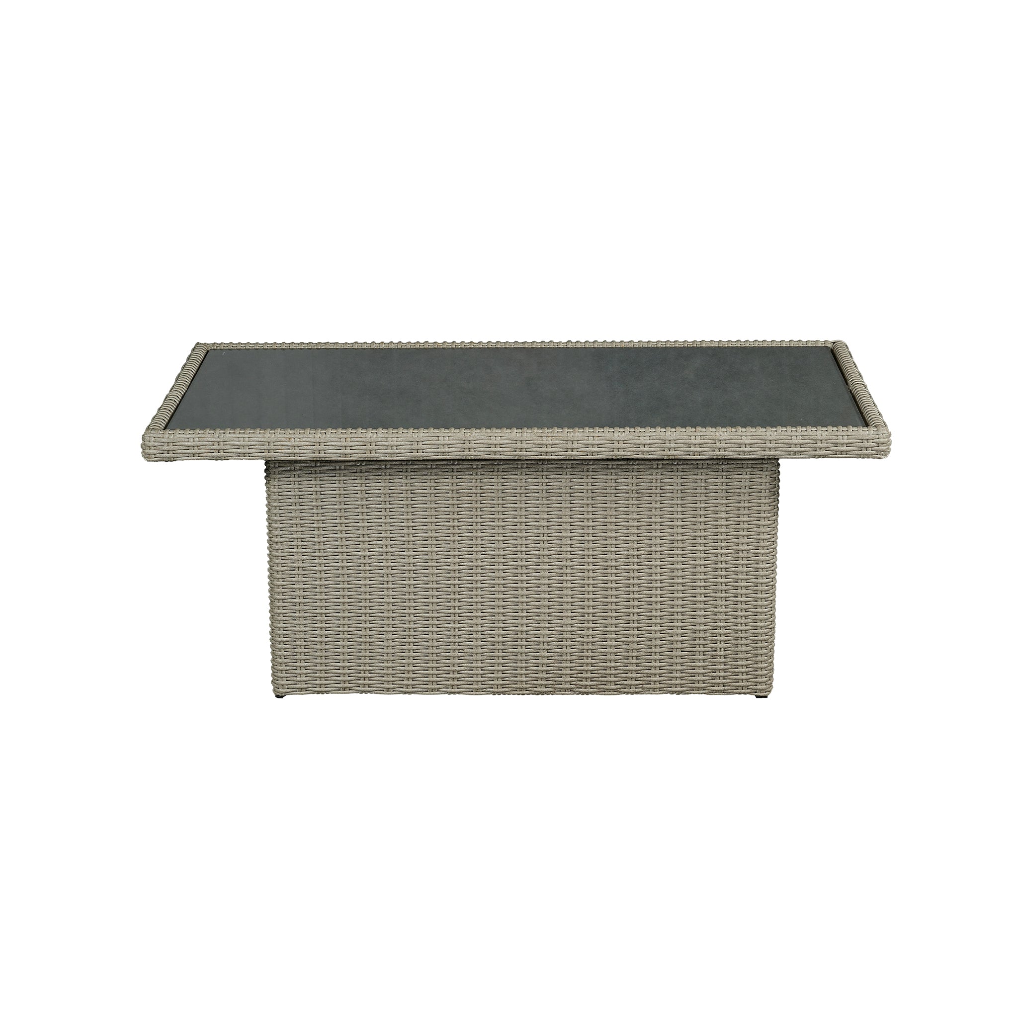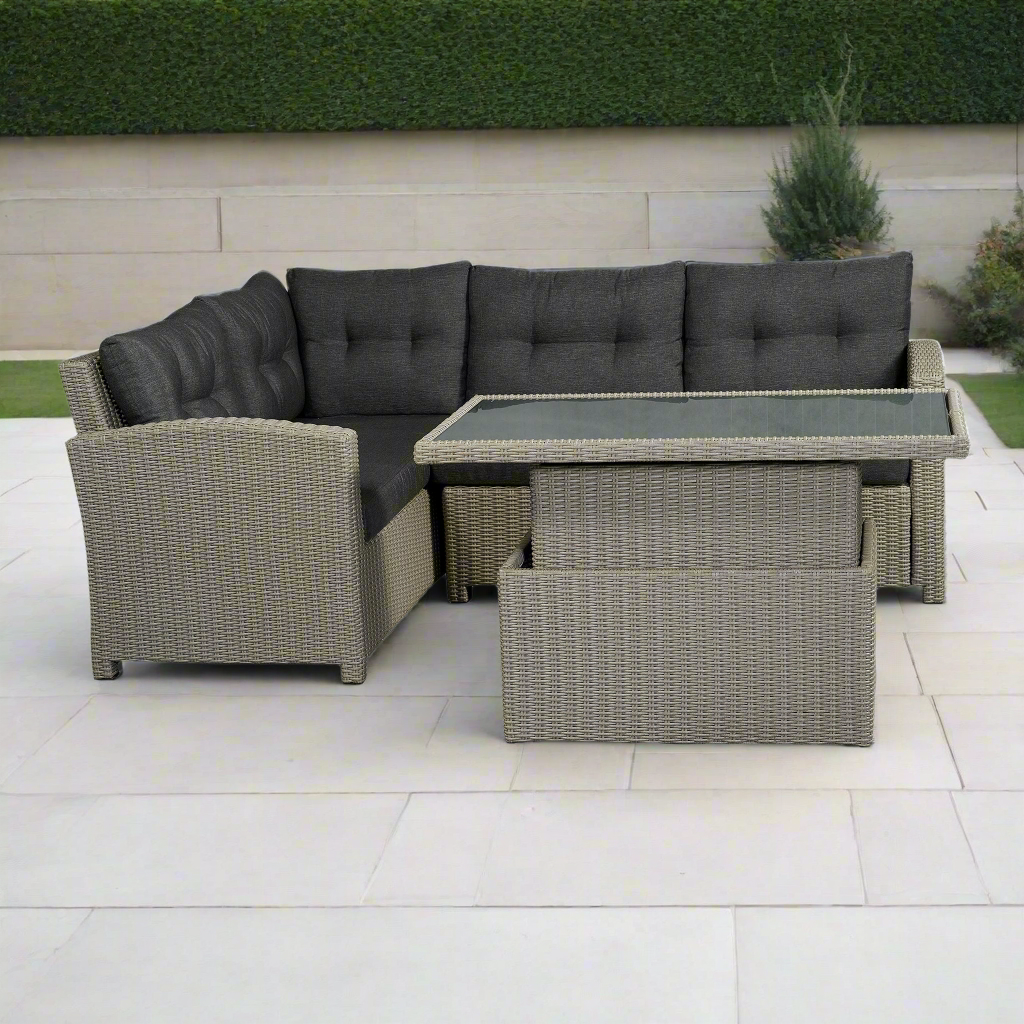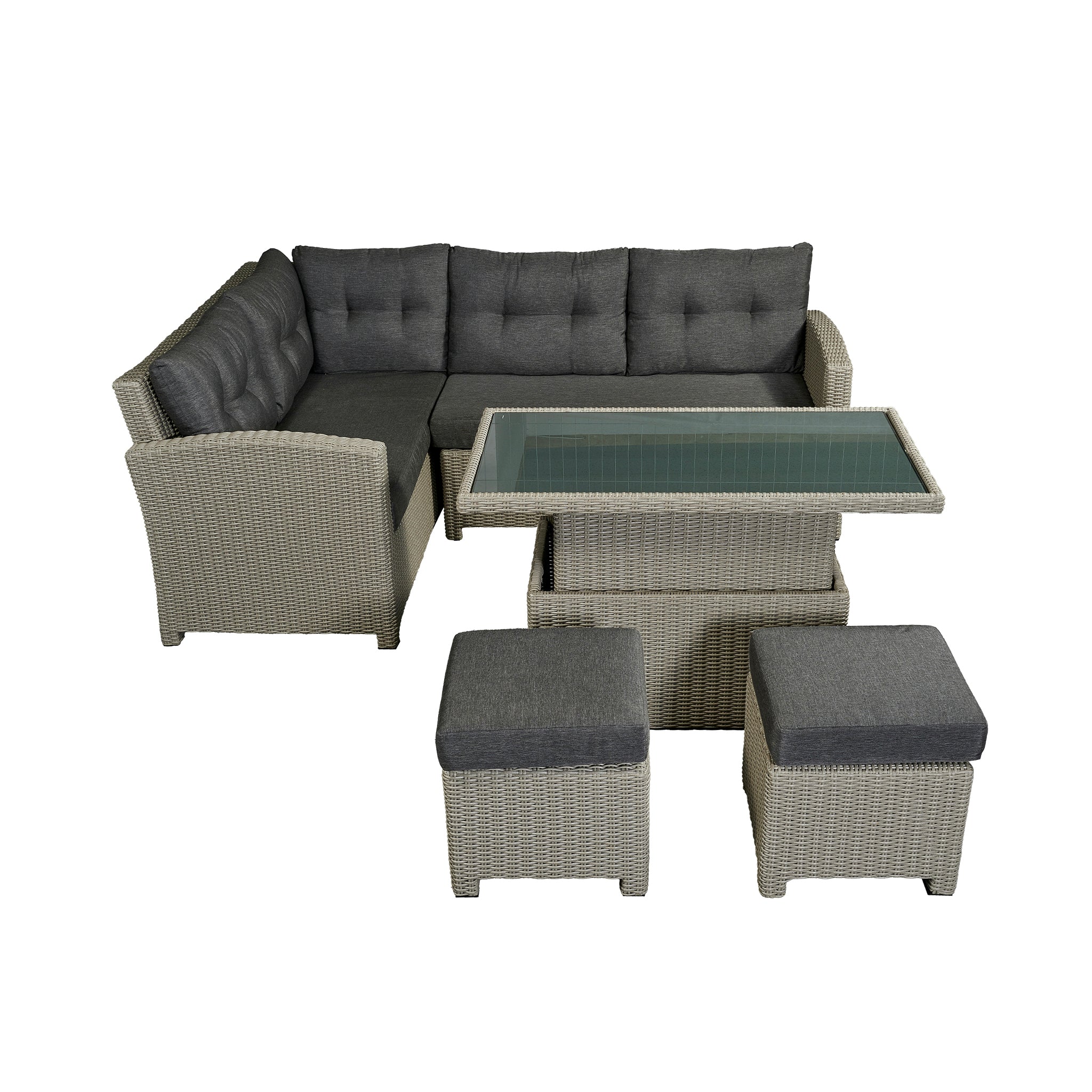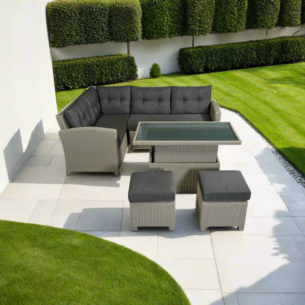 Pacito is an all-weather synthetic rattan, modular garden furniture corner sofa dining set. Constructed from high-quality aluminium, the frame is resistant to rust. The frames are welded during production to ensure maximum strength and durability, eliminating any need for additional assembly.